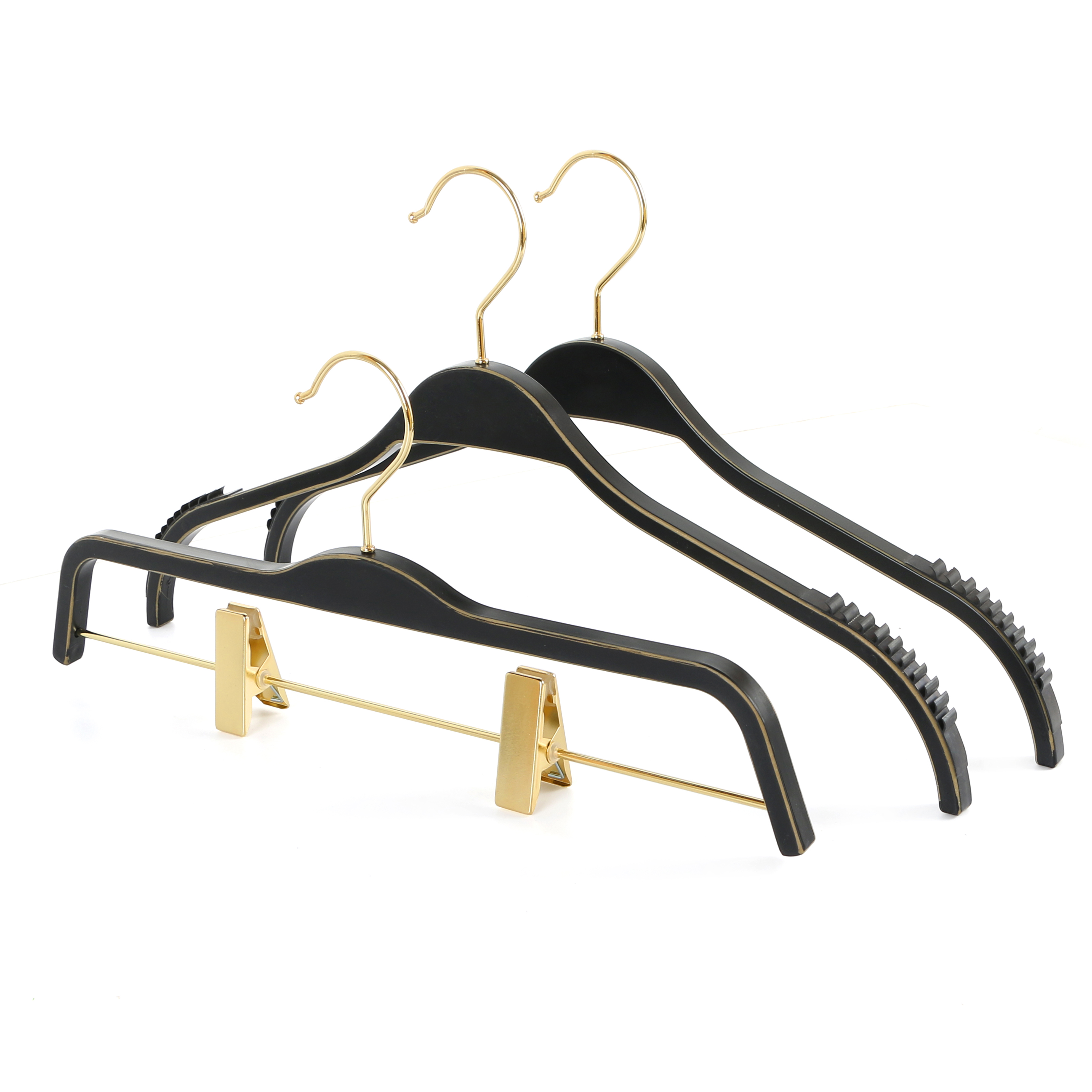 A plastic hanger with a space-saving profile for premium garment display.