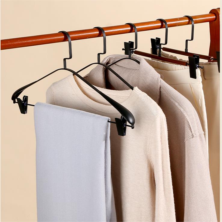 A stainless steel clip hanger for premium garment display.