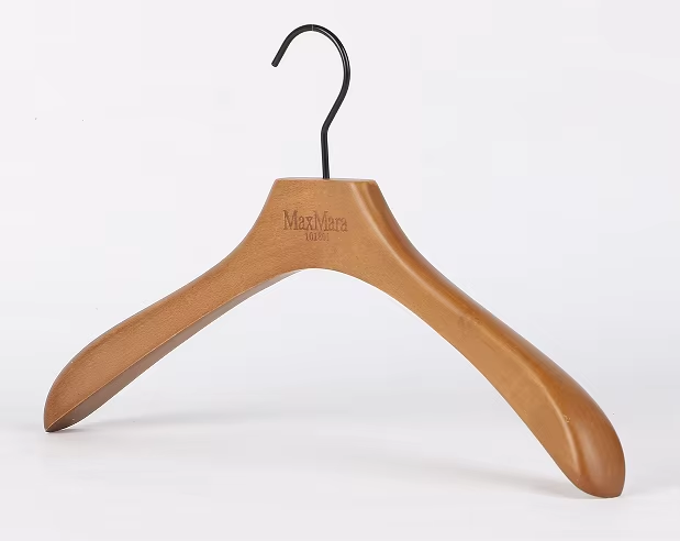 A wood hanger for premium garment display.