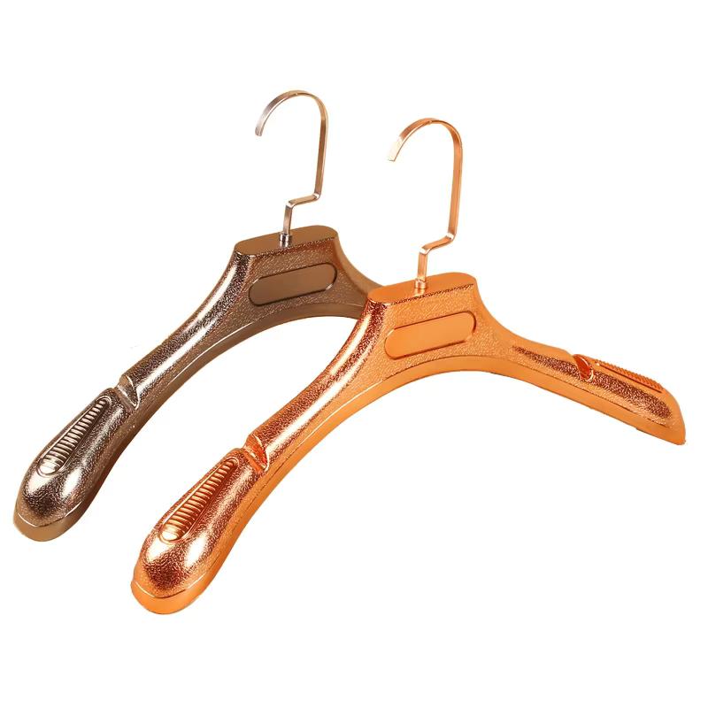 A plastic hanger for premium garment display.